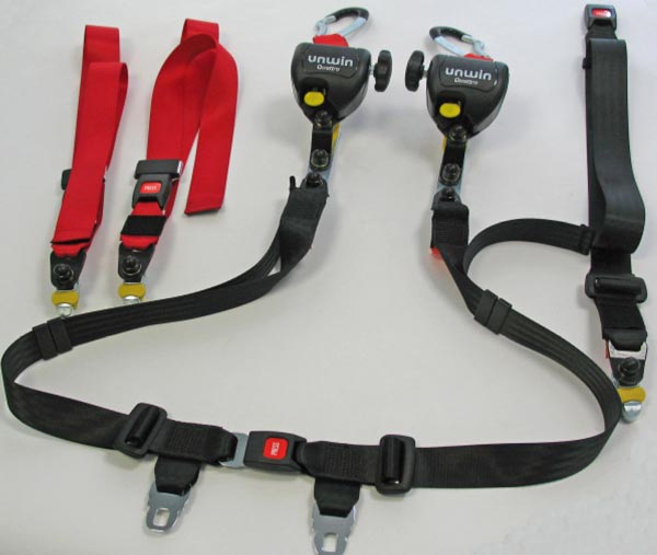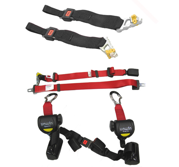 Kit ancoraggio a 4 punti per carrozzina compatibile con binario composto di due cinture frontali fisse con sistema Belt e due arrotolatori posteriori Quattro con sistema Karabiner. Cintura a tre punti per occupante con arrotolatore compatibile con kit. Kit testato ISO 10542. Con capacità 120Kg (specifico per carrozzine elettriche)