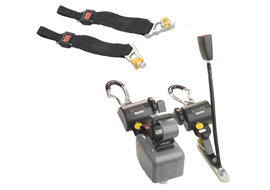 Kit ancoraggio a 4 punti per carrozzina compatibile con binario composto di due cinture frontali fisse con sistema Belt e due arrotolatori posteriori Quattro con sistema Karabiner. Cintura a tre punti per occupante compatibile con binario. Kit testato ISO 10542.