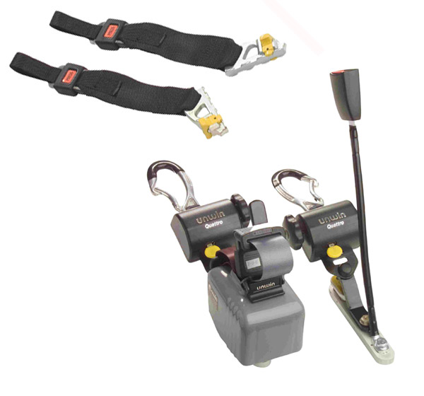 Kit ancoraggio a 4 punti per carrozzina compatibile con binario composto di due cinture frontali fisse con sistema Belt e due arrotolatori posteriori Quattro con sistema Karabiner. Cintura a tre punti per occupante con arrotolatore compatibile con kit. Kit testato ISO 10542.