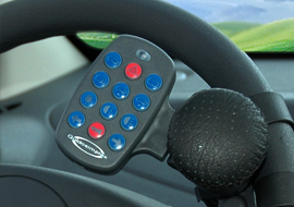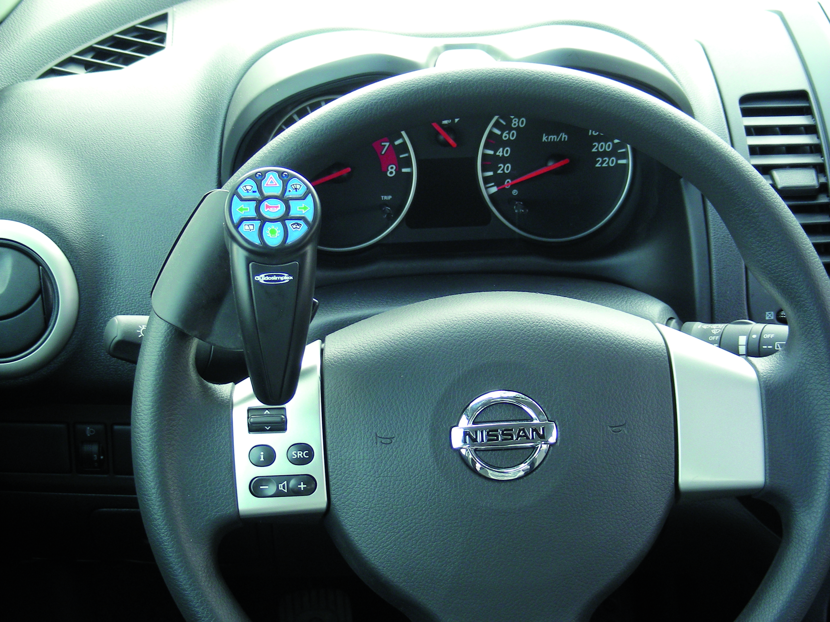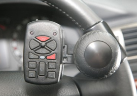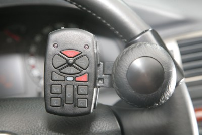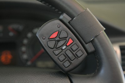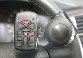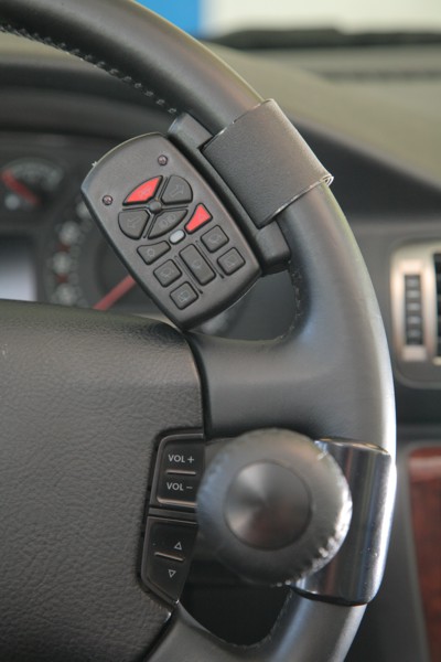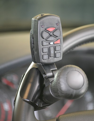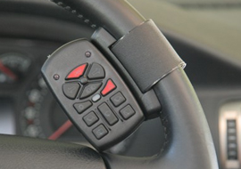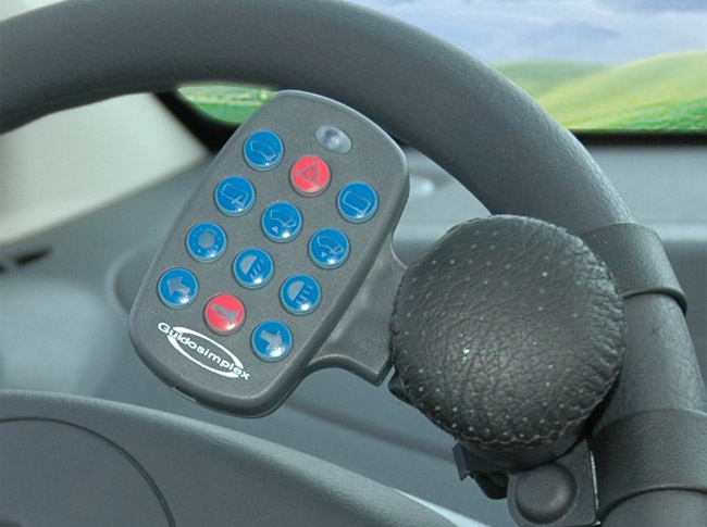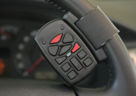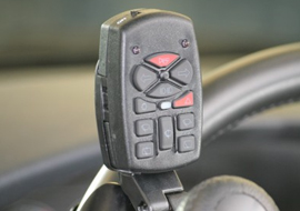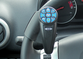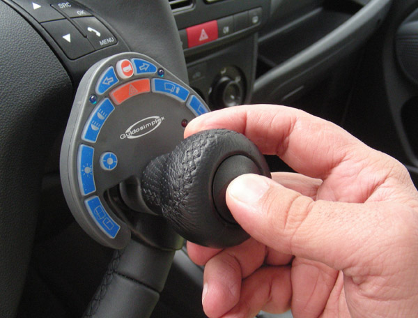 Il dispositivo applicato al volante consente, tramite una pulsantiera, di azionare i comandi luci, indicatori di direzione, tergicristalli, clacson, ecc… con estrema rapidità. La posizione della pulsantiera ha la possibilità di essere regolata al fine di consentire l’utilizzo dei tasti di selezione delle funzioni in base alla mano dell’utente.