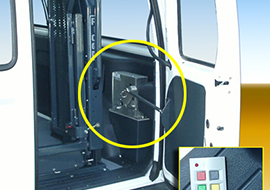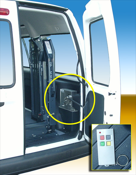 Sistema apertura porta con trasmissione a lungo braccio per accesso posteriore veicoli con porte a battente (disponibile anche con radiocomando a distanza).