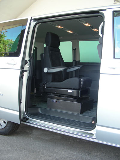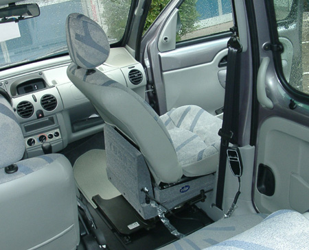 Sedile girevole Sali e scendi Turny per monovolume e fuoristrada. Il Turny è fabbricato per essere installato sotto il sedile originale. Scende fino al livello della carrozzina (450 mm). Il carico massimo è di 120 Kg.