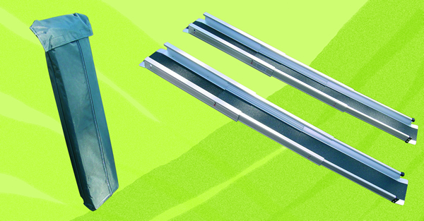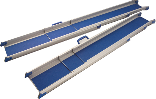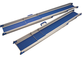 Rampa telescopica a due sezioni. Facilmente applicabile ed asportabile dalla vettura, impiegabile per l'imbarco di carrozzine manuali.