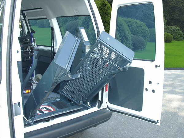Sollevatore elettroidraulico a doppio braccio. La piattaforma è realizzata in grigliato per non disturbare la visuale posteriore.