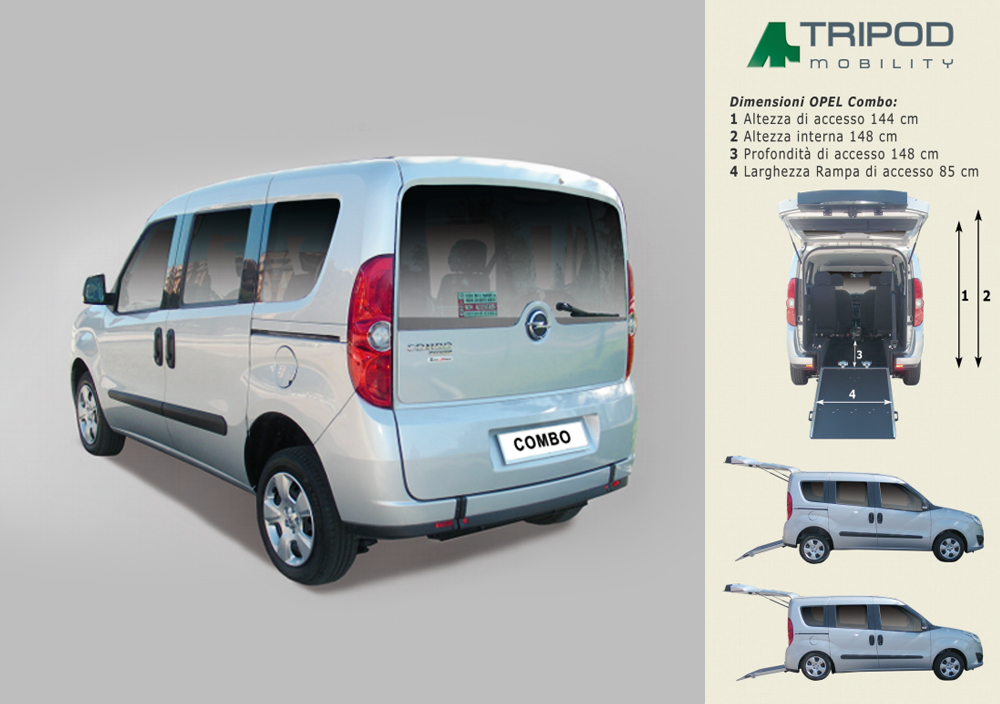 OPEL Combo è una vettura estremamente confortevole che Tripod ha adattato agli utenti in sedia a rotelle. L'auto è accessibile per quasi tutte le sedie a rotelle e scooter. Grazie alle sue ottime dimensioni, al design moderno ed al prezzo competitivo, l'Opel Combo è un modello diffuso nella sua classe.
